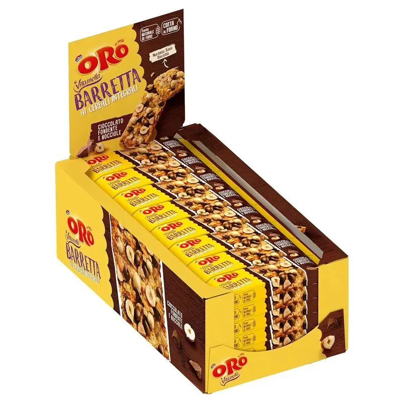 Oro Vitasnella barretta ai cereali integrali al gusto di cioccolato fondente e nocciole è una barretta low fat ideale per i tuoi snack mattutini o pomeridiani. Morbida base di biscotto ricoperta con intere nocciole sulla parte superiore dello snack.