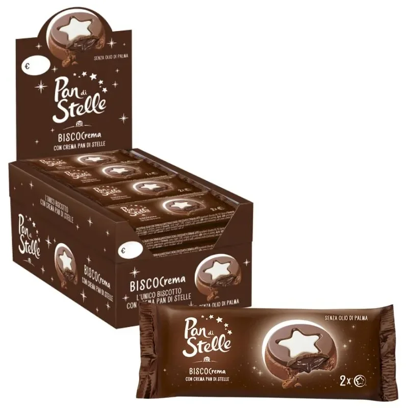 Pan di Stelle Biscocrema unisce due fragranti biscotti al cacao con una deliziosa crema Pan di Stelle e un cuore di crema al latte e granella di biscotto. Il formato T2 contiene 2 biscotti per confezione, perfetti da condividere o da gustare ovunque.